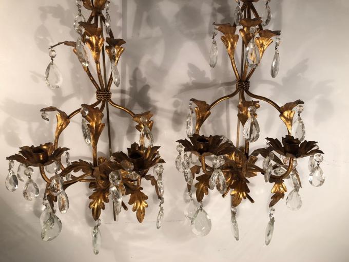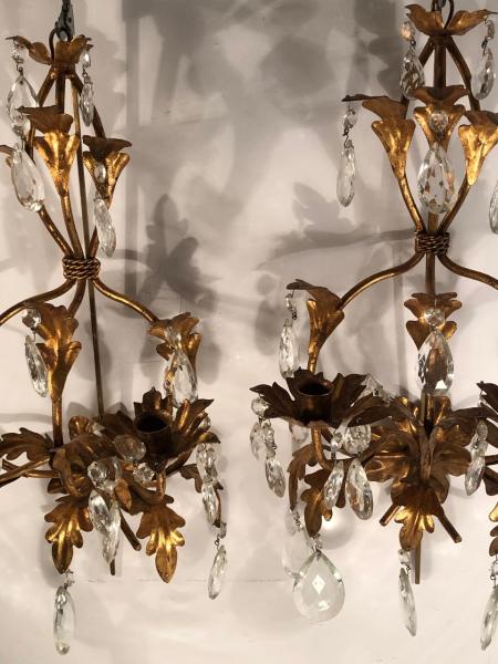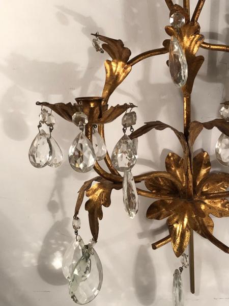 PAREJA DE APLIQUES. ITALIA. HIERRO Y CRISTAL. 27X17X48 CMS