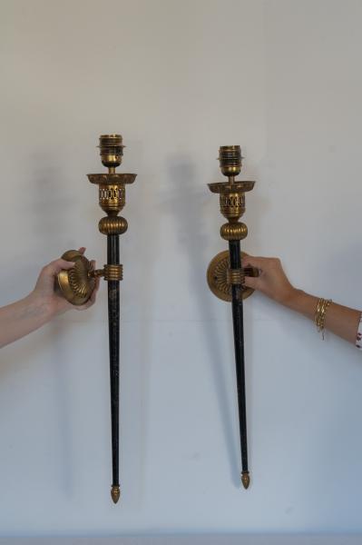 PAREJA DE APLIQUES. AÑOS 60. FRANCIA. HIERRO Y LATÓN. 10X15X60 CMS